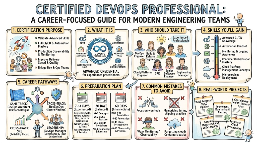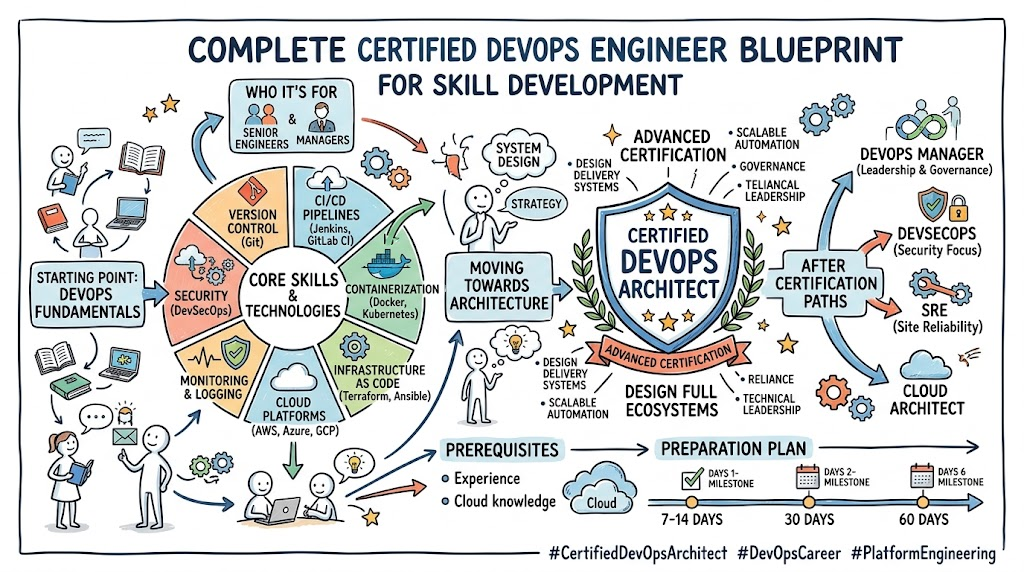Certified DevOps Architect is a valuable certification for professionals who want to move from execution-focused work into system-level design and architecture ownership. It combines delivery thinking, CI/CD planning, cloud strategy, automation, infrastructure design, governance, security, and resilience into one meaningful career path. For engineers, it builds technical maturity. For managers, it improves visibility into how modern delivery systems should be designed. For senior professionals, it strengthens credibility for higher responsibility roles. If your goal is to design better platforms, standardize delivery, support multiple teams, and grow into advanced technical leadership, Certified DevOps Architect is a strong and practical step forward.