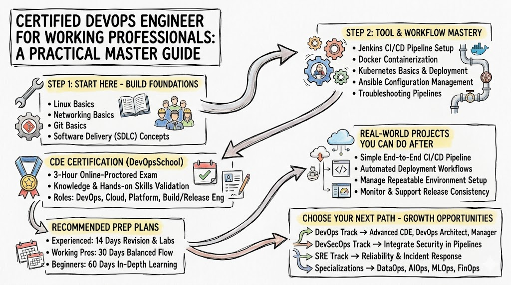 This path is ideal for professionals who want deeper ownership of automation, release systems, CI/CD, cloud delivery, and engineering workflows. Start with DevOps fundamentals, gain real project experience, move through professional-level learning, and then reach architect level through Certified DevOps Architect.