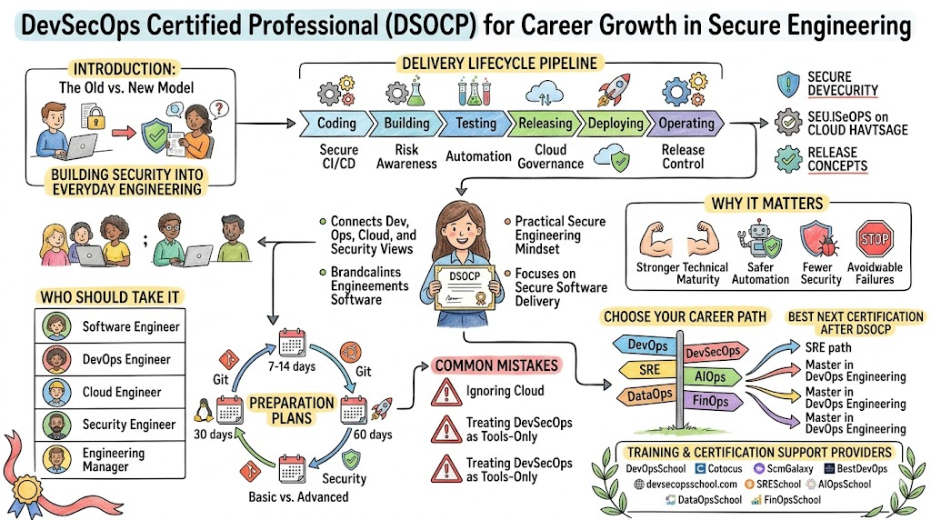 DevSecOps Certified Professional is a strong certification for engineers and managers who want to make software delivery safer, more mature, and more aligned with how modern engineering really works. Modern delivery systems are fast, automated, cloud-driven, and full of moving parts. That makes security awareness essential. DSOCP helps professionals understand how secure delivery should fit inside development, CI/CD, cloud usage, release flow, and operations. For software engineers, it improves role readiness. For managers, it improves team guidance. For both, it creates a stronger path toward long-term growth in modern engineering careers.